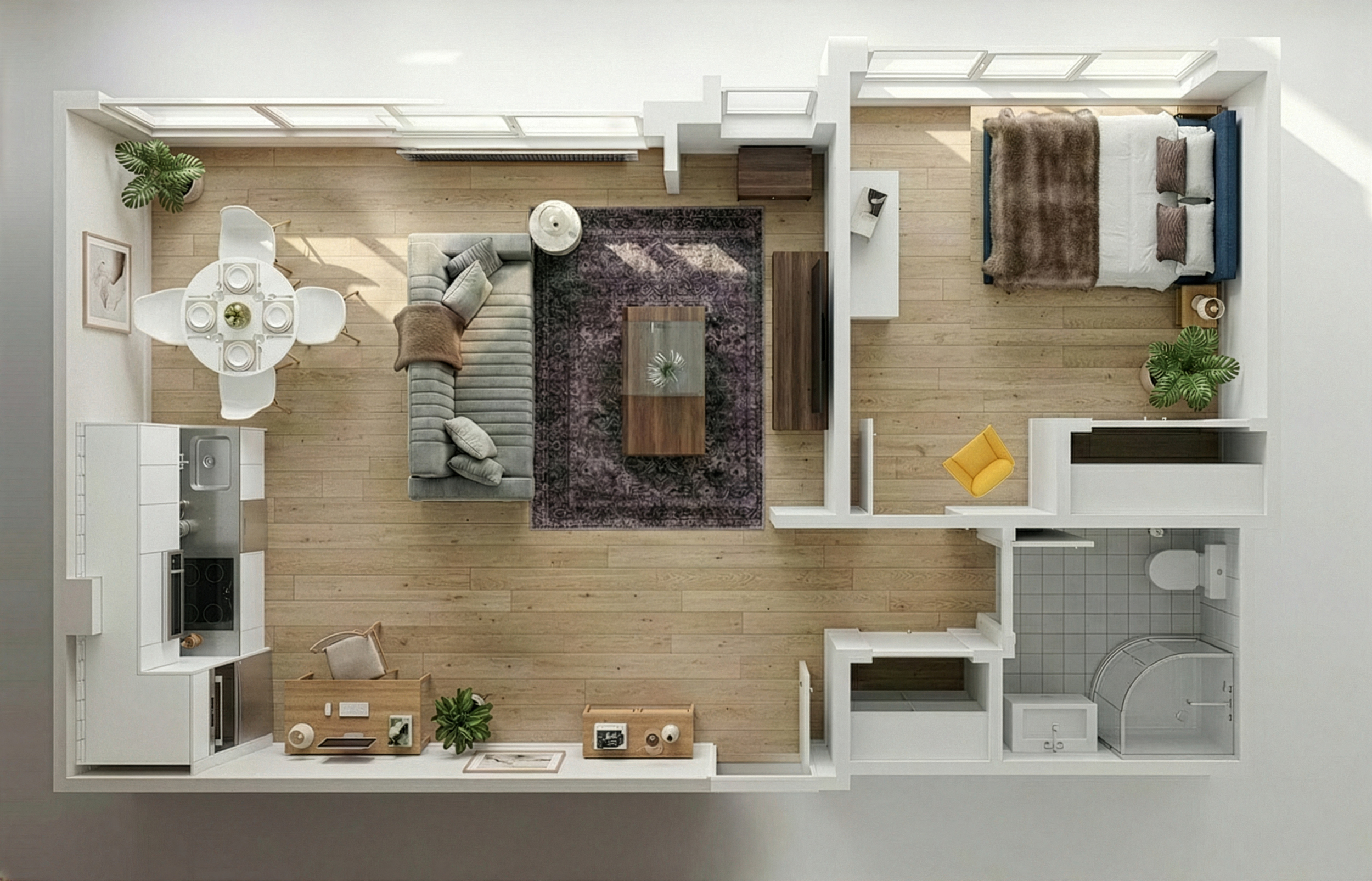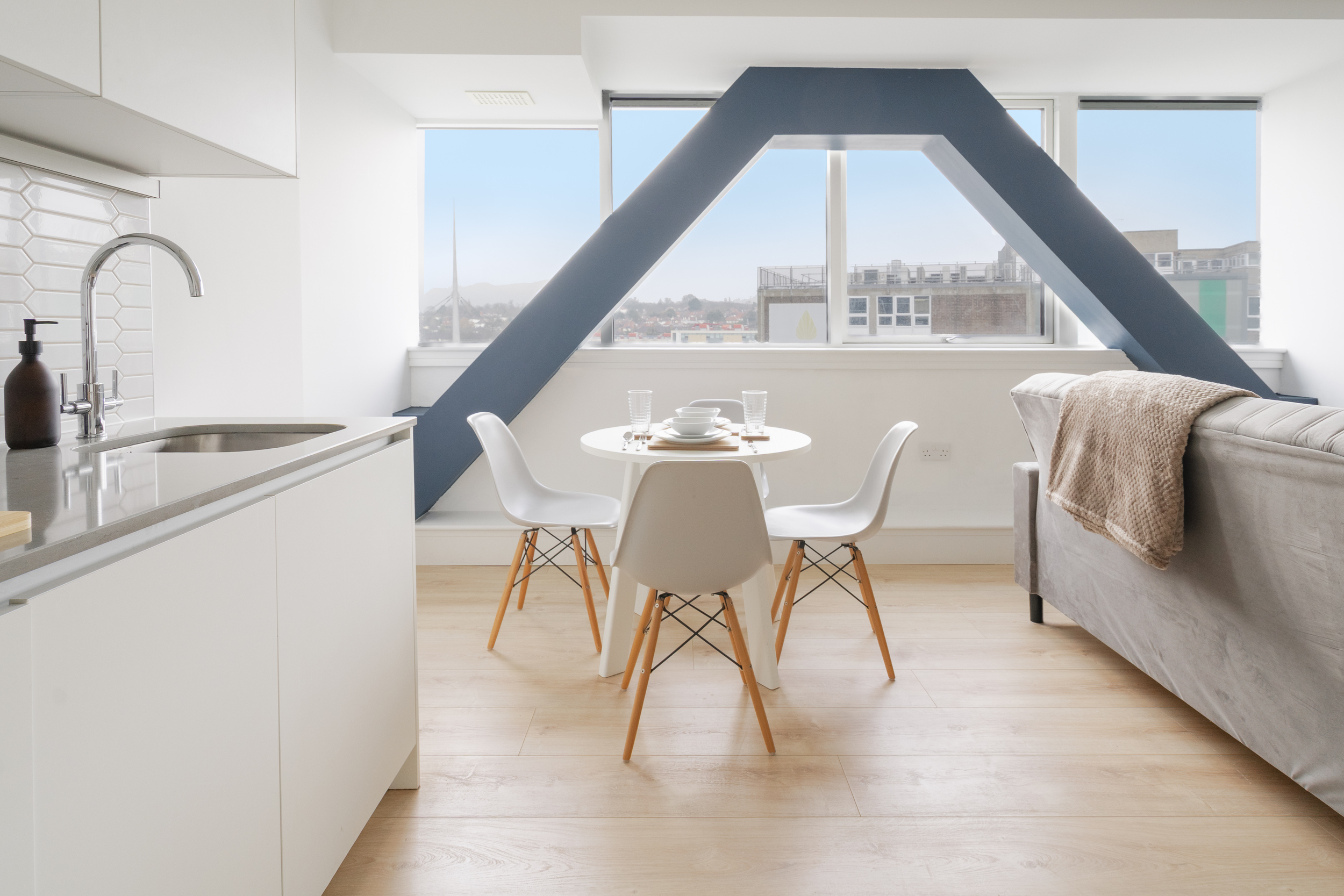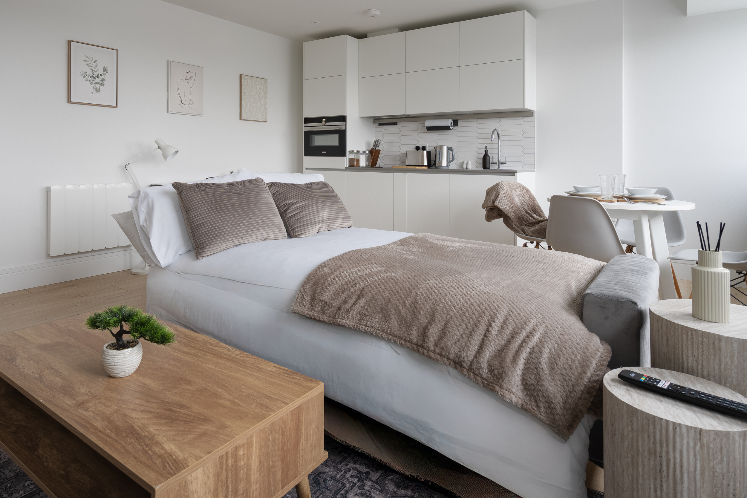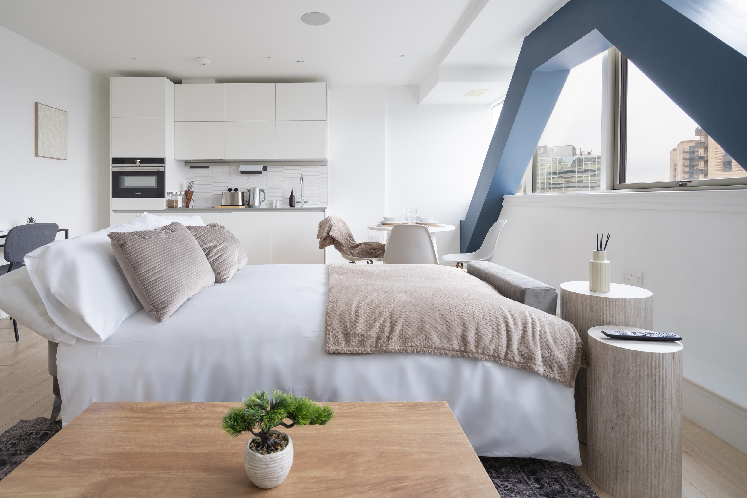The apartment features a bright and contemporary open-plan living area, complete with a comfortable sofa bed, fully equipped kitchen, and a sleek, spacious bathroom. The bedroom offers a relaxing retreat with quality furnishings designed for a restful stay.